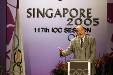 7月6日,法國總統希拉克親自在新加坡舉行的國際奧委會(IOC)第117屆大會中,為巴黎發表申奧陳述。巴黎、倫敦、紐約、馬德里和莫斯科共同角逐2012年夏季奧運會主辦權,IOC將在6日稍晚在新加坡投票選出主辦城市。圖據路透社