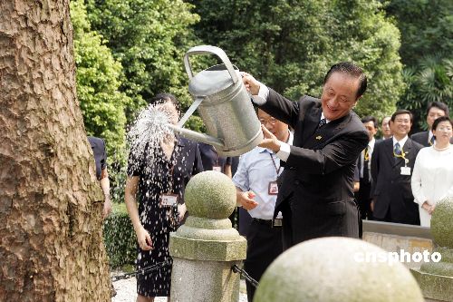 新黨主席郁慕明率領(lǐng)的新黨“民族之旅”訪問團七月七日拜謁廣州黃花崗七十二烈士陵園,并向一九一二年孫中山先生種下的馬尾松澆水培土。作者:毛建軍