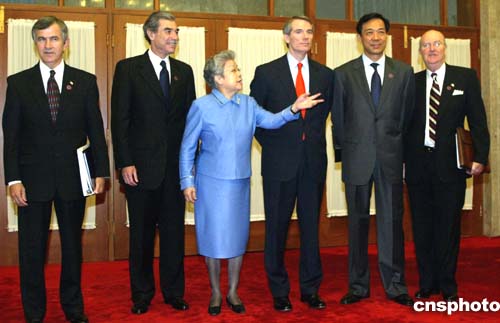 中國國務(wù)院副總理吳儀(左三)與美國商務(wù)部長古鐵雷斯(左一)、美國貿(mào)易代表波特曼(右一)、美國農(nóng)業(yè)部長約翰斯(右二)步入會(huì)場。作者:廖文靜