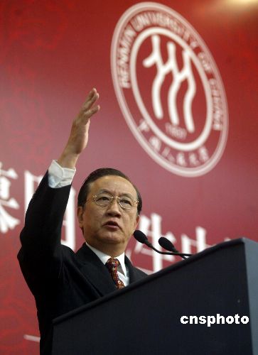 最后引用中山先生的話,我在中山陵已經講過,但是我在中國人民大學這里也要講一句同樣的話,中山先生說“革命尚未成功,同志仍需努力”。中山先生一生追求的是聯合世界上平等待我之民族,共同奮斗。今天中華民族是跟其他民族可以和平相處的,中國的崛起是和平的崛起。所以我們追隨中山先生這樣一個偉大的抱負。年輕朋友們,路是大家走出來的,統一尚未完成,同胞仍需努力。謝謝大家!(根據電視錄音整理)