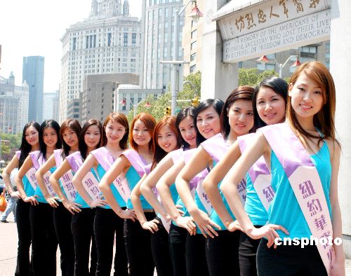 當地時間七月十二日,二○○五紐約華裔小姐競選決賽候選佳麗,在位于紐約華埠的華裔軍人紀念坊前合影。作者:龔文謨