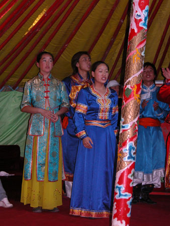隨后,工作人員將把游客引領到傳統(tǒng)蒙古族居所——蒙古包內。蒙古包內的桌子上擺有蒙古族傳統(tǒng)食品,包括奶茶、黃油、奶豆腐等。在工作人員嘹亮蒙古族民歌歌聲與悠揚馬頭琴的伴奏下,游客可以盡情享用美食。