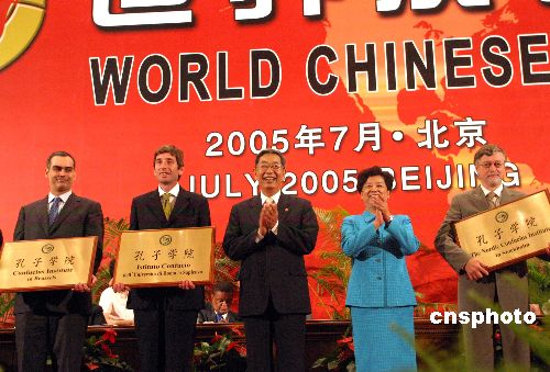 七月二十日,世界漢語大會在北京人民大會堂開幕。來自海內外五百余名政要、政府官員、大學校長、著名漢學家和漢語教學工作者,將共同探討“多元文化架構下的漢語發展”。圖為全國人大副委員長許嘉璐、國務委員陳至立為孔子學院授牌。作者:張勤