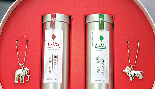 茶葉禮盒以他們姓氏寫有“許諾一生愛”和“徐徐品人生”