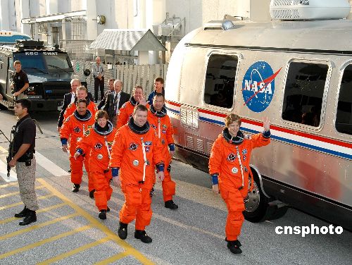 美國(guó)“發(fā)現(xiàn)號(hào)”機(jī)組在嚴(yán)密保護(hù)下乘車