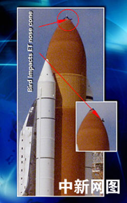 一幅電視圖片顯示,一只鳥可能在“發現號”航天飛機發射的時候撞擊了燃料箱的最前端部分。