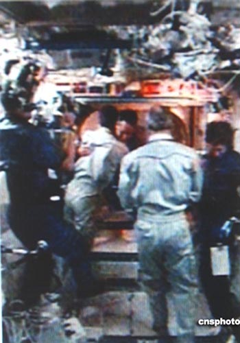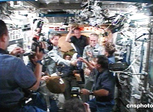 對接前,機長科林斯和駕駛員凱利駕駛飛機后翻,讓空間站機組為發現號的防熱裝置拍照。來自太空不同角度的航天飛機圖像史無前例,為NASA這次飛行和未來的飛行提供了寶貴的資料。