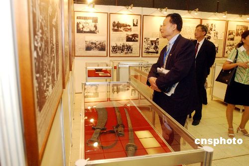 《紀念中國抗戰暨世界反法西斯戰爭勝利六十周年展覽》將在8月10日于香港展覽中心舉行。圖為9日布展現場的展品和圖片吸引觀眾。作者:洪少葵