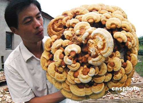揚州市維揚區西湖鎮農民鄭玉權展示他培育的一株特大靈芝。該靈芝呈扁圓形,赤黃色,直徑有68厘米,重5千克,其上面還附有近百個小靈芝頭。如此大的靈芝在當地實屬罕見。作者:張丙濤