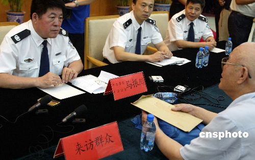 八月十八日,北京市公安局局長馬振川(左)接待來訪的京城市民,傾聽來訪民眾反映的實(shí)際問題。今天,北京警方共設(shè)立了二十個(gè)接待點(diǎn)集中接待來訪市民。作者:任海霞