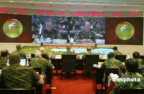 2005年8月21日15時(shí)50分,對(duì)“和平使命—2005”中俄聯(lián)合軍事演習(xí)來(lái)說(shuō),是一個(gè)重要的時(shí)刻。中俄聯(lián)合軍事演習(xí)中方總導(dǎo)演葛振峰上將和俄方總導(dǎo)演莫爾堅(jiān)斯科伊上將,共同批復(fù)了此次軍演的聯(lián)合戰(zhàn)役決心書和決心圖。