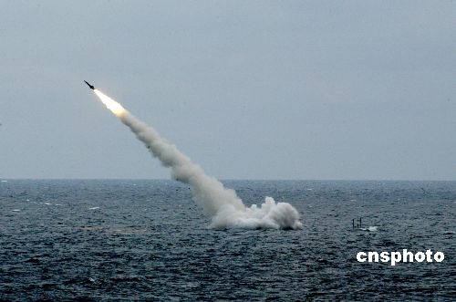 二十三日,“和平使命——2005”中俄聯(lián)合軍事演習第三階段——實施交戰(zhàn)的海上封鎖演練在中國黃海海域進行。圖為中國新型潛艇水下發(fā)射導彈出水瞬間。作者:王麗南