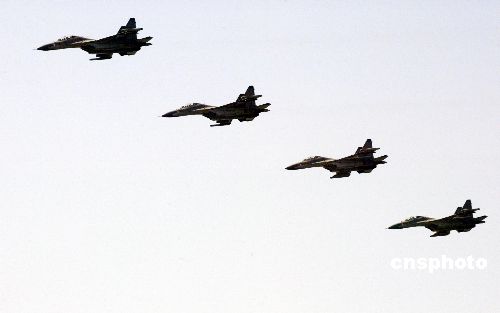 中俄聯(lián)合軍事演習(xí)海上封鎖演練中,蘇-27飛機以編隊形式飛過戰(zhàn)區(qū),與艦艇協(xié)同作戰(zhàn)。作者:王麗南