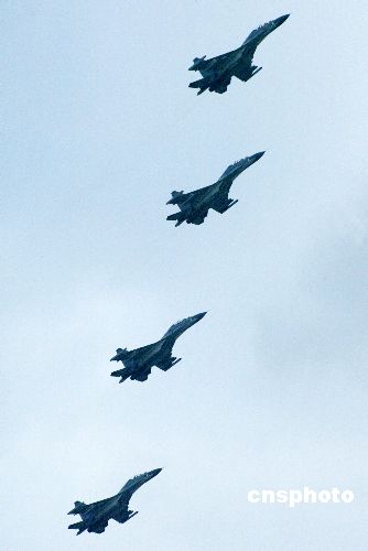 八月二十四日,“和平使命—2005”中俄聯合軍事演習第三階段兩棲登陸作戰實兵演練在山東半島展開。圖為參加兩棲登陸作戰實兵演練的中國空軍殲擊機四機編隊飛臨演習地域上空。作者:王麗南