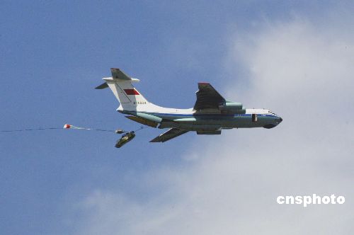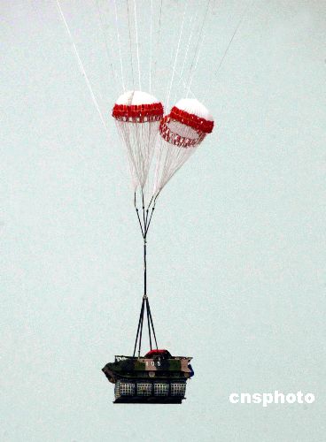 圖為中國空軍運輸機空投裝甲戰車,裝備底部的防震墊清晰可見。作者:王麗南