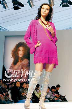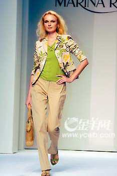 幾大品牌紛紛提倡“拜金”,卻各有“金招”,其中最出位的要屬M(fèi)ARINA RINALDI。但見(jiàn)普通的白襯衫被釘上了金色鉚釘,休閑長(zhǎng)褲的外側(cè)爬滿(mǎn)金光閃閃的蝴蝶與花草,長(zhǎng)長(zhǎng)的頸巾布滿(mǎn)了金色閃片,針織背心的肩頭被金屬片飾加以勾勒,就連風(fēng)衣前襟都散落著大大小小的金屬閃片,令人拍案叫絕。