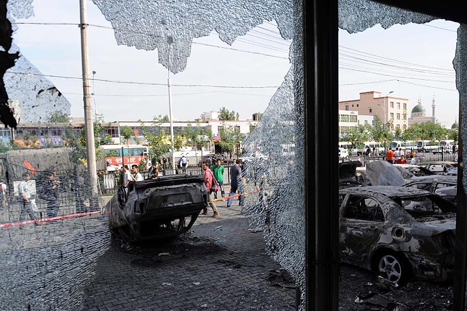7月7日,新疆烏魯木齊市的一家吉利汽車4S店情景。該店在5日發(fā)生的暴力事件中被犯罪分子縱火焚燒,店內(nèi)外的新車全部被毀。中新社發(fā) 摩攀 攝