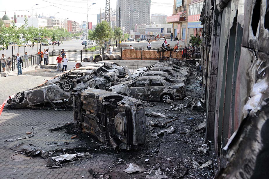 7月7日,新疆烏魯木齊市的一家吉利汽車4S店情景。該店在5日發生的暴力事件中被犯罪分子縱火焚燒,店內外的新車全部被毀。中新社發 廖攀 攝