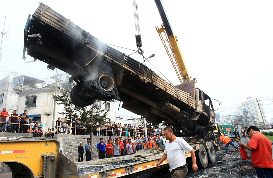 7月6日,烏魯木齊市的工作人員在清理被犯罪分子焚燒的汽車。在5日晚發生的嚴重暴力犯罪事件中,已造成140人死亡,800多人受傷;被毀車輛達260部;受損門面房203間,民房14間,總過火面積達到56850平方米,全市共有220多處縱火點,有兩棟樓房被燒毀。中新社發 劉新 攝