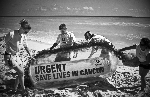 11月28日,墨西哥坎昆,環(huán)保人士在海邊游玩,他們身旁為國際樂施會放置的巨型瓶子,瓶中寫有呼吁環(huán)保的標語。