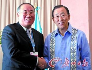 8日,正在坎昆出席聯(lián)合國氣候變化大會的國家發(fā)改委副主任、中國代表團(tuán)團(tuán)長解振華(左)與聯(lián)合國秘書長潘基文舉行會見。