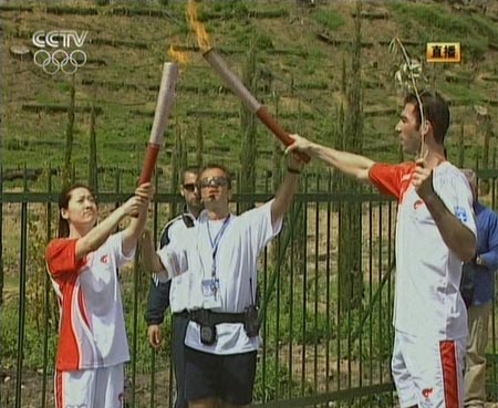 來自中國的前奧運冠軍羅雪娟從希臘火炬手亞歷山大•尼克拉澤斯手中接過2008北京奧運會圣火,從而成為參與北京奧運圣火傳遞的第一位中國人。