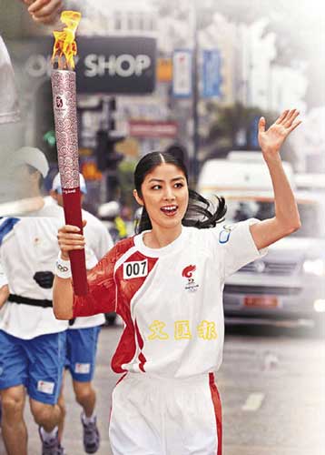 汪明荃昨日盛裝打扮出任火炬手,沿途不斷和市民打招呼。阿姐事后表示,心情興奮。她會(huì)將火炬放在辦公室,她亦表示會(huì)把火炬帶去供天水圍的小朋友拍照,因?yàn)樵谒艿男谐讨校牭胶枚嘈∨笥汛蠼校骸凹佑停≈袊佑停 ? 植毅儀、李慶全、黃國強(qiáng))