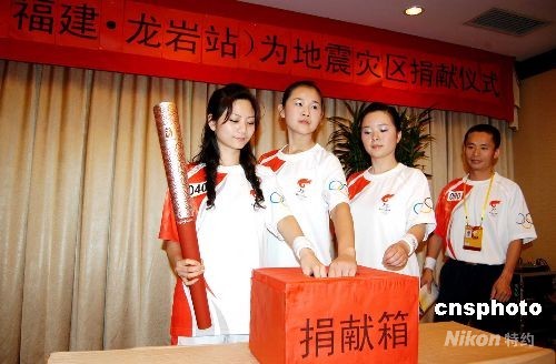 圖:福建龍巖火炬手為地震災區民眾捐款