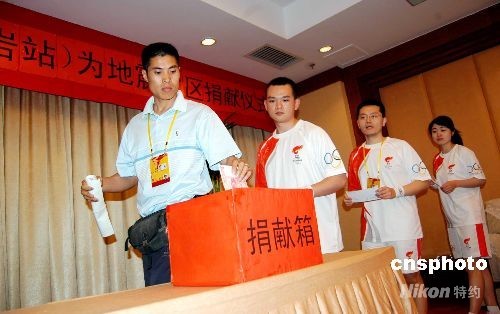 五月十三日,參加福建龍巖圣火傳遞的大部分火炬手一起為四川汶川地震災區的民眾捐款。當日,奧運圣火在福建龍巖傳遞。 中新社發 傅丹丹 攝