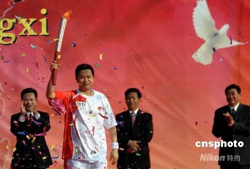 五月十四日,奧運圣火傳遞瑞金站舉行起跑儀式,中共瑞金市委書記陳曉春作為第一棒火炬手起跑。 中新社發(fā) 廖攀 攝
