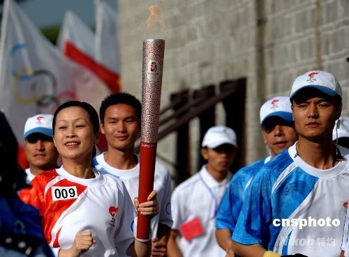 五月十四日,奧運圣火傳遞在江西瑞金起跑,火炬手在中華蘇維埃共和國中央政府舊址傳遞火炬。 中新社發(fā) 廖攀 攝