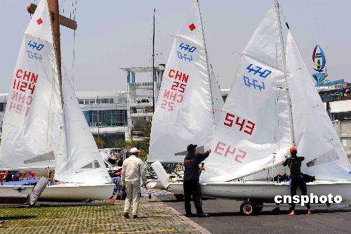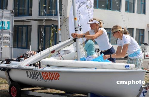 為迎戰二00八北京奧運會帆船比賽,美國帆船對已于近日來到奧運會帆船賽舉辦城市青島的奧帆賽訓練基地,進行賽前的場地適應性訓練。圖為美國帆船隊的隊員們準備下海訓練。 中新社發 曲連遵 攝