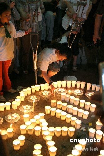 2008年5月21日,全國哀悼日的第三天,上海市政府對面的人民廣場上擠滿了對汶川地震遇難同胞哀悼的人群。在人群中有一位拄著拐杖的女孩,她便是奧運火炬手金晶,在周圍人群的攙扶下,她艱難的彎下腰點燃蠟燭并向汶川地震遇難同胞默哀。 中新社發 俊影 攝