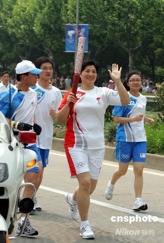 5月23日,北京奧運圣火在上海開始為期2天的傳遞,共有416名火炬手參加。圖為女排名宿李國君在滬傳遞奧運圣火。 中新社發 湯彥俊 攝