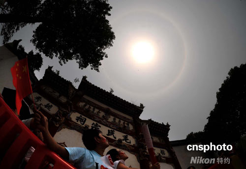 6月5日,奧運圣火湖南傳遞在韶山結束后,天空出現日暈奇觀,毛氏宗祠前為圣火歡呼的人們仰望奇觀。中新社發 廖攀 攝