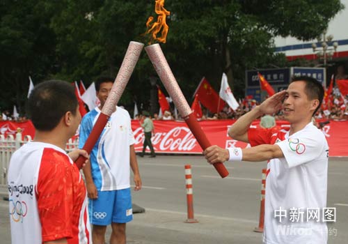 9時36分,黃勝新接力點燃手中的火炬時,又莊嚴的行了一個軍禮,激動之情溢于言表。“第二個軍禮我是向火炬敬的!”黃勝新說, “盡管祖國經(jīng)歷了汶川大地震,但是看到奧運的圣火在自己的面前順利的傳遞,就相信祖國一定能戰(zhàn)勝震災(zāi),更相信祖國有決心、也更有信心把奧運會辦好,為祖國加油,為奧運增彩!