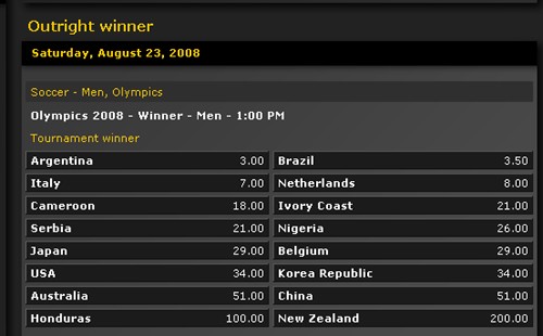 除了阿根廷國奧以3倍賠率高居榜首之外,從2-16名的隊伍分別為:意大利(7)、荷蘭(8)、喀麥隆(18)、科特迪瓦(21)、塞爾維亞(21)、尼日利亞(26)、日本(29)、比利時(29)、美國(34)、韓國(34)、澳大利亞(51)、中國(51)、洪都拉斯(100)和新西蘭(200)。