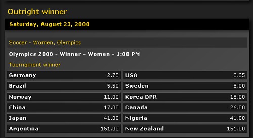 以東道主入圍的中國男足女足被足協均寄予厚望,特別是在國足無緣2010年世界杯的大環境下,足協領導希望能在奧運會上為中國足球成功“正名”。不過BWIN的賠率還是非常冷靜,中國國奧隊奪冠賠率高達51倍,僅排在新西蘭和洪都拉斯之前,和澳大利亞并列倒數第三。