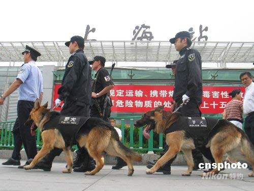 為了提高鐵路安保等級,確保奧運期間鐵路運輸和旅途安全,從7月24日起,鐵路警方抽調特警小分隊進駐上海站廣場,攜警犬晝夜巡邏。中新社發 陳煥聯 攝