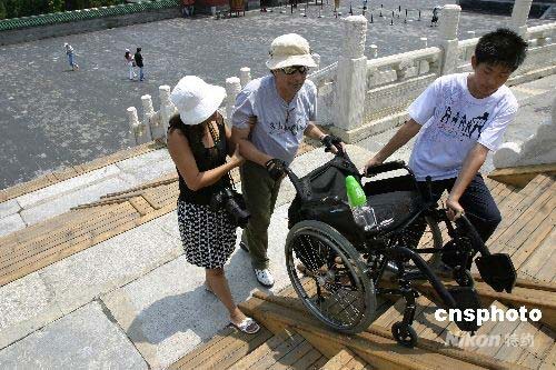 2008年7月15日,一位有腿疾的外國游客在他人的幫助下登上無障礙臺階。為迎接奧運會及殘奧會,方便殘疾游客,北京天壇公園首次在祈年殿東側(cè)臺階搭建無障礙設(shè)施,搭建工作于近日完成。中新社發(fā) 魯谷 攝
