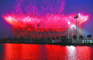 昨晚8時2分,“砰”的一聲巨響后,萬朵煙花圍繞著“鳥巢”開始盛放,組成了絢麗的圖案。當晚,“鳥巢”煙火試放分4個階段依次進行,璀璨的煙花在空中組成笑臉、奧運五環等經典圖案,與場內表演相呼應。記者 陳杰 攝