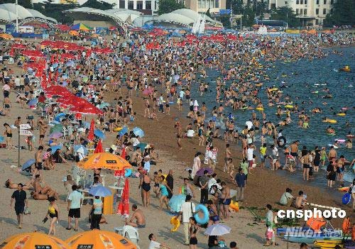 青島第一海水浴場游泳的游人爆滿。經過一個多月的全力奮戰,困擾2008北京奧運會帆船賽舉辦地青島的近海滸苔已得到了有效的清除和遏制,奧帆賽訓練比賽場地和海水浴場又恢復了往日的熱鬧景象。中新社發 曲連遵 攝