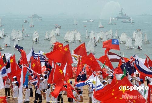 奧運火炬在山東青島傳遞,在傳遞終點青島第一海水浴場,青島青年在帆船密布的海邊揮舞旗幟為北京奧運加油。中新社發 廖攀 攝