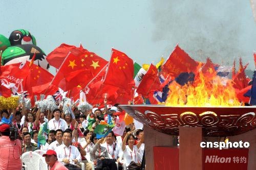 圖:奧運圣火在青島海濱熊熊燃燒