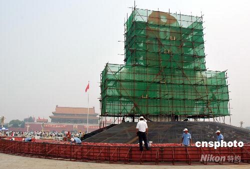 北京天安門廣場(chǎng)中央“中國(guó)印·舞動(dòng)的北京”奧運(yùn)會(huì)會(huì)徽花壇與噴泉水池正在建立之中。其中“中國(guó)印”為L(zhǎng)ED光源燈箱,可以旋轉(zhuǎn),整個(gè)廣場(chǎng)花壇都采用了夜景照明設(shè)計(jì),達(dá)到白天看花,晚上看燈的效果。中新社發(fā) 張雙雙 攝
