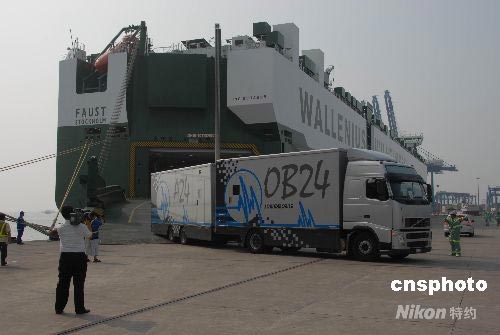 7月24日,瑞典籍大型滾裝船舶“弗斯特”號裝載的58輛高清電視轉播車在天津港滾裝碼頭接卸上岸。這批世界上最為先進的電視轉播車來自英國、法國、比利時等6個國家,它們將全部被用于北京奧運會的電視轉播。 中新社發 胡志強 攝