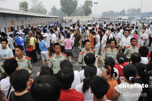 7月25日上午9點(diǎn),最后82萬(wàn)張北京奧運(yùn)會(huì)比賽門(mén)票開(kāi)始銷(xiāo)售。銷(xiāo)售現(xiàn)場(chǎng)異常火爆,購(gòu)買(mǎi)門(mén)票的群眾分批進(jìn)入等候,武警官兵一字排開(kāi)維持現(xiàn)場(chǎng)秩序。中新社發(fā) 王宇婷 攝