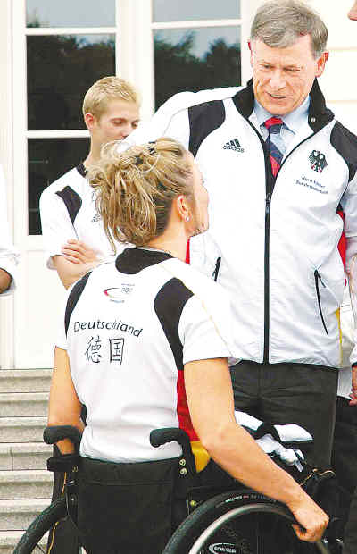 克勒還愉快地接受了在場中國記者的采訪。在談到德國代表團的目標時,克勒說,他不想給運動員增加壓力,重要的是,大家要從比賽中獲得快樂,各國運動員要為世界人民的互相理解做出貢獻?死崭嬖V本報記者,他將高興地按原計劃參加北京殘奧會開幕式。