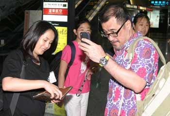 高金素梅率團(tuán)體前往北京參加北京奧運(yùn)表演彩排,在機(jī)場巧遇唱片制作人李宗盛(右),兩人互動(dòng)熱絡(luò),相約北京見。 “中央社”圖