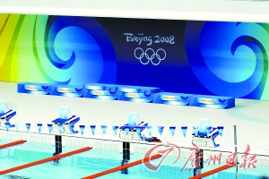 走進“水立方”,令人眼前一亮,最直觀的感覺就是這里氣派了。跳水臺的后面位置早已掛起了“BeiJing 2008”的巨幅背景圖。而在游泳池的另一側,工人們也在抓緊時間安裝大屏幕。其實,早在今年年初的“好運北京”游泳測試賽時,這里就已經安裝了一塊大屏幕。但在“水立方”的巨大空間里,當時無論是媒體還是運動員都感覺這塊大屏幕太小了,坐在靠近跳水池的最遠處根本無法看清楚大屏幕上顯示的圖像。為了能讓現場觀眾有更好的視覺感受,如今,原來那塊大屏幕旁又豎立起了一個大屏幕,而且還比原來的屏幕大了1/3。另外,游泳池兩側更是懸空掛上了兩個屏幕:“這邊3塊,加上跳水臺那邊也懸掛了一塊大屏幕,現在比起年初那會兒,一共多了4塊大屏幕,”程秀麗告訴記者,“我們不僅要為運動員營造一個好的比賽氛圍,更要為觀眾營造一個觀賽氛圍。”